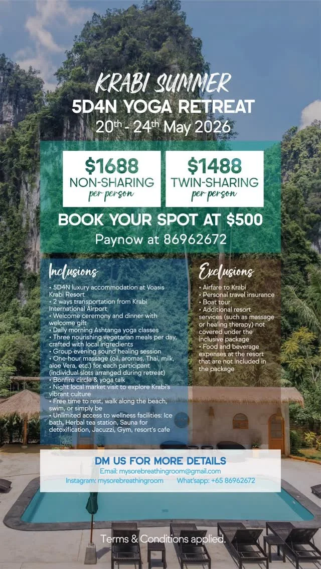 KRABI YOGA RETREAT 20th - 24th May 2026 BOOK NOW ASHTANGA WORKSHOP WITH YAN & MANUEL 25th - 28th June 2026 REGISTER NOW 200 HOURS YOGA TEACHER TRAINING 2026 15th August - 31st October 2026 REGISTER NOW 300 HOURS ADVANCED YOGA TEACHER TRAINING Weekend 2025 - 2026 FIND OUT MORE MYSORE CLASS TIMING MBR CLASS PASSES Connect with us on Instagram View fullsize View fullsize View fullsize View fullsize View fullsize View fullsize